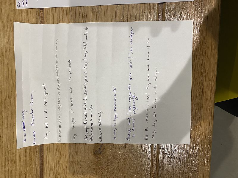 We started the session by warming up with a Frankenstein story: a piece of paper is passed around, and each person writes a sentence. They then fold over the piece of paper so that the next writer is unaware of what was written. Please take a look at the photos to see how they turned out! The Frankestory, of course, had to be grounded in Tudor England.