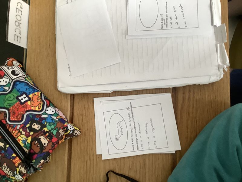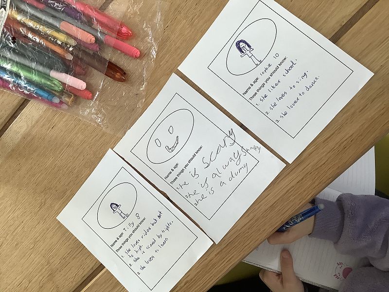 Once the character cards were made, Ali and I went around collecting them. We then got each person to select 3 cards (ones they hadn’t created themselves) and use the three new characters to write a story!